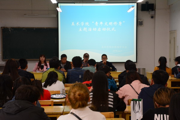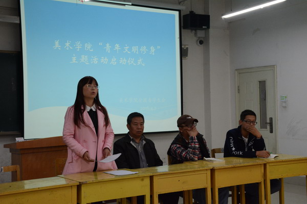 为了进一步贯彻学生处关于组织开展大学生文明修身主题活动的文件精神,增强我院青年学生文明礼仪修养,提高学生自身的思想道德素质,全面推进我院学风建设。2016年4月7日,美术学院青年文明修身主题活动启动仪式在3#504举行,学院党总支书记贾志明、学工办主任唐艳丽、辅导员匡扶、学生会全体成员以及各班级班委、党员和入党积极分子80多人参加了此次活动。