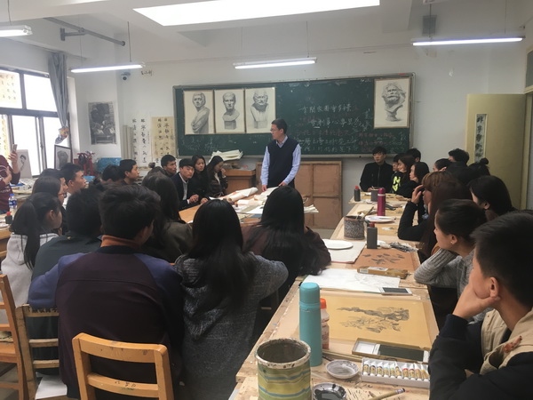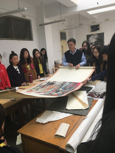 张文军老师对中国书画的装裱与保护有着极为深刻的理解,他从中国书画的工具材料性能特点、传统书画装裱技艺到古籍文物修复做了深入的讲解。由于当代大学生在现实生活中对中国传统美术技艺认知渐行渐远,也缺乏深入了解书画传统装裱工艺的机会,在两个多小时的讲座中,同学们和张老师互动交流,气氛热烈,共同分享了张老师对传统书画保护与装裱的理解和感悟。张文军老师的精彩讲座为同学们普及了基本的传统装裱工艺常识,纠正了很多对于传统工艺的认识偏差和误区,对提高同学们的文化素质和艺术修养将产生积极的影响。