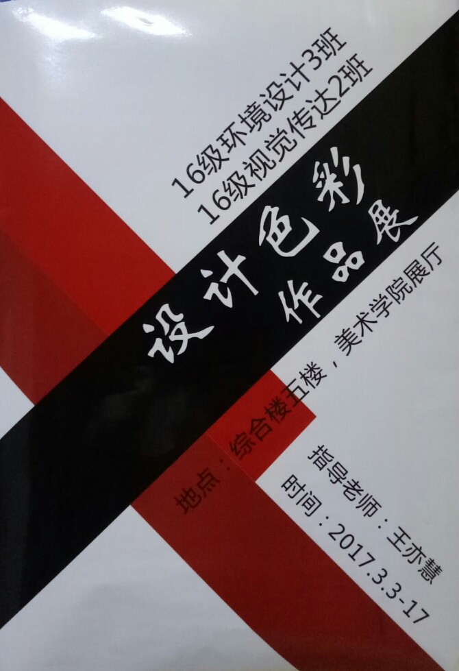 2017年3月3日至3月17日,2016级环境设计3班携手视觉传达设计2班在综合楼五楼美术学院展厅共同举办《设计色彩》课程作业展。此次课业展中共展出装饰色彩作品七十余幅,主要的图案设计元素来自敦煌壁画藻井图案、传统刺绣纹样和现代插画等;作品使用的材料也比较多元化,主要有纸浆、沥粉和综合材料。本次展览是我院“以展促学”特色教学的集中展示,也是对新生教学成果的一次验收和评估。通过展览有效的促进了学生专业基础课程的创作兴趣以及创新精神,增强了学生对于自己设计作品的展示自信,也拓宽了师生、学生之间的学习交流渠道,同时也充分展示了我校丰富的校园文化。
