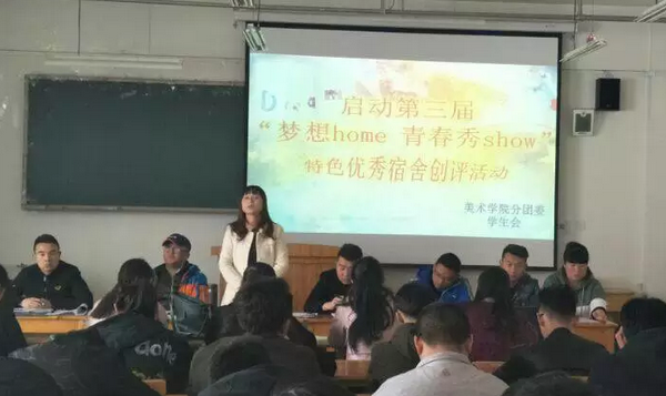 为了打造积极健康、昂扬向上的宿舍文化,加强学生安全文明行为的意识,消除宿舍不安全不文明的现象和行为。 2017年3月8日中午美术学院在1号楼604召开“梦想home,青春show”特色优秀宿舍创评活动启动仪式。参加会议的有学工办主任唐艳丽,分团委负责人匡扶、郭子宏以及学生会主席谢迪,副主席潘存旺、李奉祥。14级,15级,16级的各班班长,学习委员,生活委员,团支书及学生会成员。