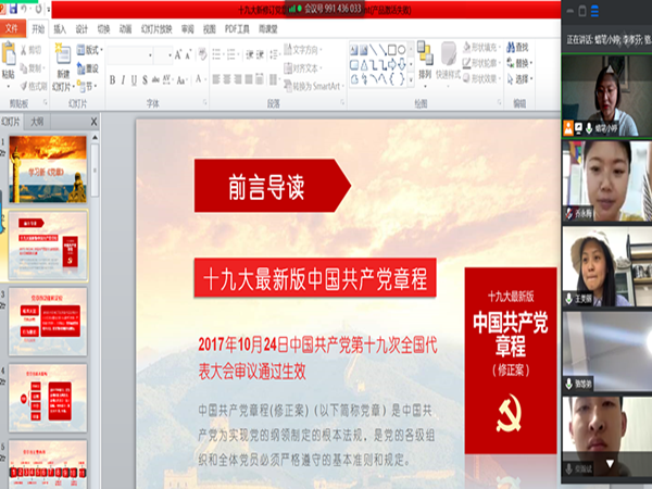 为深入学习贯彻党章党规和《中国共产党支部工作条例》(试行),5月21日中午,yl7703永利学生第一支部依托腾讯会议平台开展了线上主题党日活动,全体学生党员和入党积极分子参加,会议由支部书记万婷主持。