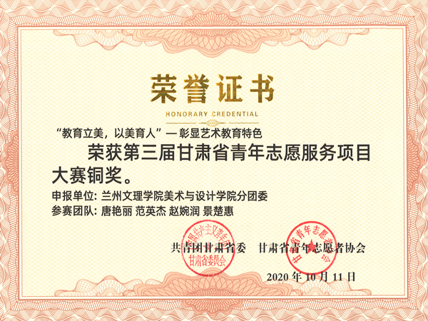 1011日上午9:30分,第三届甘肃省青年志愿服务项目大赛颁奖仪式庄严举行。本次大赛设有金奖、银奖、铜奖和优秀奖四类奖项,其中yl7703永利申报项目“教育立美,以美育人”——彰显教育艺术特色取得了铜奖的优异成绩。
