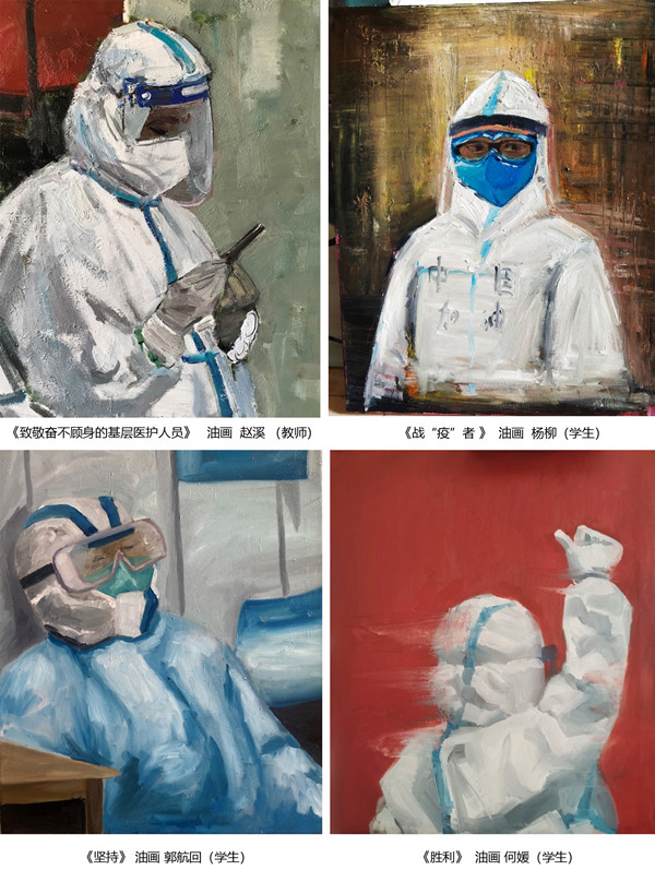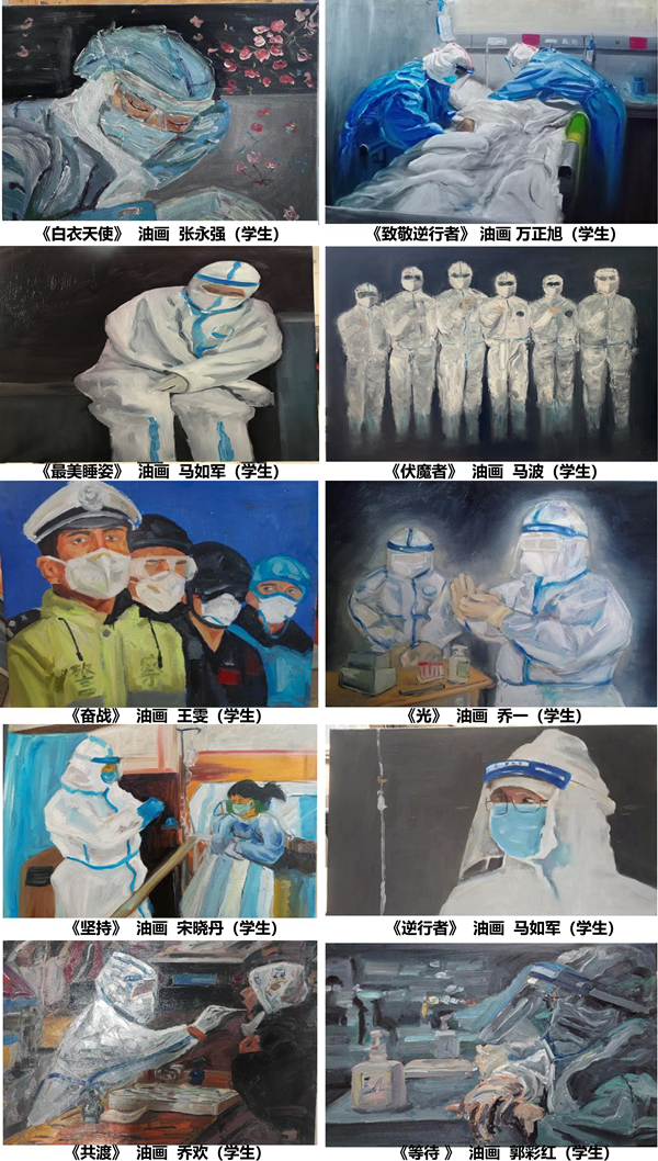 尽管疫情还在持续,正常的线下教学暂时无法按计划实施,但学院师生积极配合各类疫情防控工作,认真落实教育部提出的“停课不停教、停课不停学”活动,将在疫情期间“线上教学”中开展课程思政教育的要求落到实处。在《专业综合实训油画》课程线上教学过程中,授课教师针对当下疫情防控现状,积极利用海量自媒体宣传图像,加以选择。并引入当下“抗疫”前线的典型场景及感人事迹,让学生发挥课程特点和专业特长,将“抗疫”的正面典型与专业实训结合起来,指导学生开展主题创作。用艺术作品讴歌战斗在疫情一线的工作者,描绘和记录这个特殊时代的精神图谱,精心创作新时代的英雄赞歌。同时也是在教学中对“课堂思政”教学理念的践行和落实。