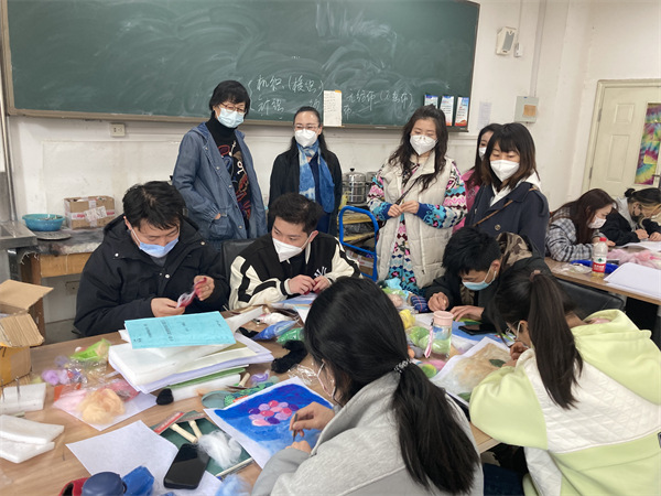 最后,老师们观摹了温晓晖老师的羊毛擀毡课程,并与温老师和正在上课的同学们进行了讨论与交流,进一步深入了解了我们的专业优势、特色及教学方式,并计划来我校就羊毛擀毡、扎染等课程进修学习。