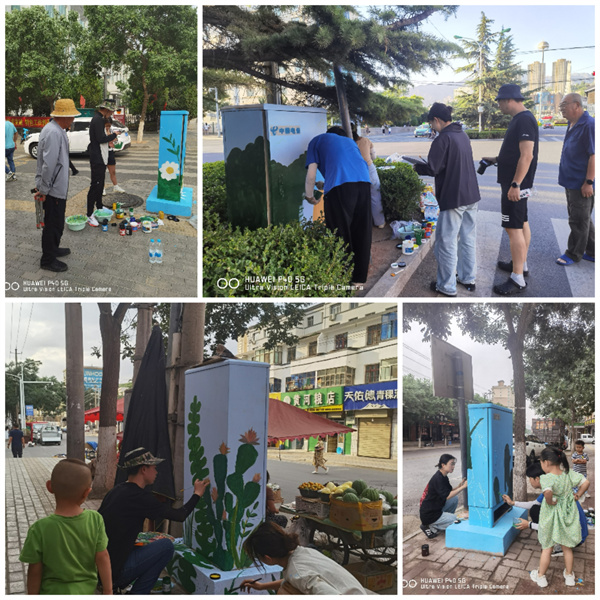 (图为志愿者在黄河北岸老城区进行电箱彩绘工作)