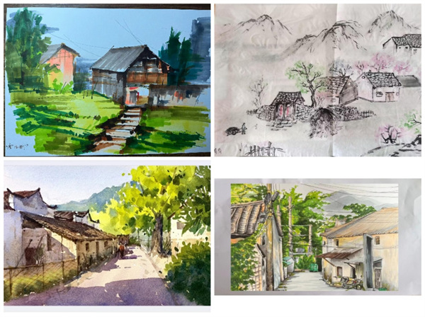 (图片为2021级绘画2班霍钰栋作品《平凉七府村》,2021级视觉传达2班张倩倩作品《平凉关山古道》,2022级环设2班邵敏敏作品《宁县盘克街道一角》,慕倩倩作品《环县环城镇街景》)