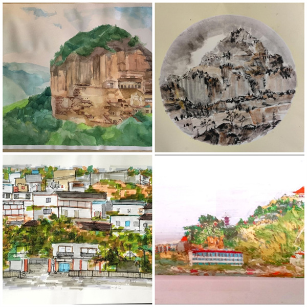 (图片为2022级绘画专业王静作品《天水麦积山》,2022级环设2班骆思雨作品《丰收之后》武山县关山村,2022级环设2班包玉珍作品《天水市高楼镇街景》,2022级环设2班刘环作品《秦安县凤山公园》)