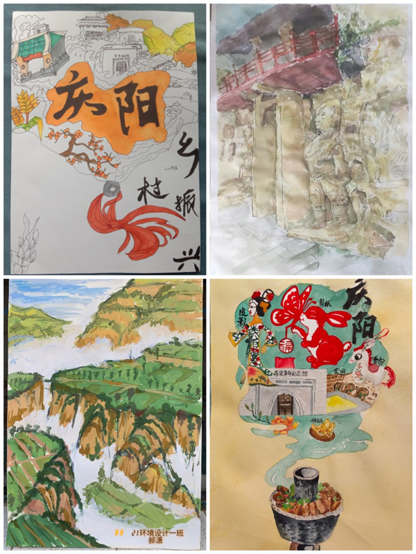 (图片为2021级视觉传达设计2班赵静作品《魅力庆阳》,2022级视觉传达设计1班张研作品《庆阳北石窟寺》,2021级环设1班郝潇作品《庆阳的清晨》,2022级绘画专业赵晨阳作品《绘美庆阳》)