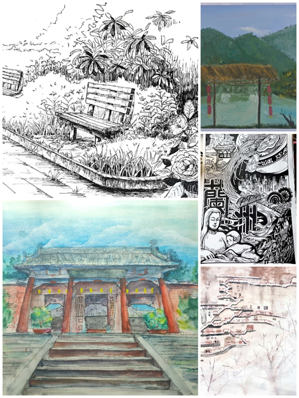 (2021级环设1班闫丽作品《武山县鸳鸯湖》、王蓉作品《崆峒小景》、李广茹作品《映像天水》、2021级环设2李鑫作品《魅力南坪山》甘肃省定西市临洮县南坪镇)