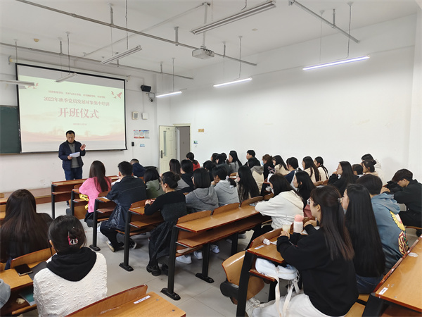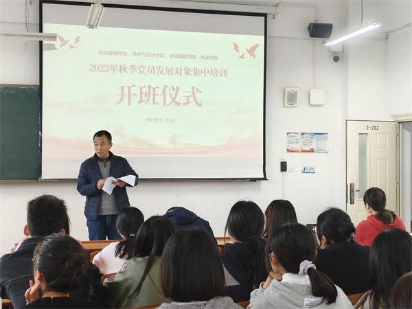 2023年11月2日中午,经济管理学院、yl7703永利、音乐舞蹈学院、外语学院于2-202教室联合举办2023年秋季党员发展对象集中培训班开班仪式,各学院党支部新确定备案的50名党员发展对象参加开班仪式,并聆听了马克思主义学院曾令琼教授的首场专题讲座。