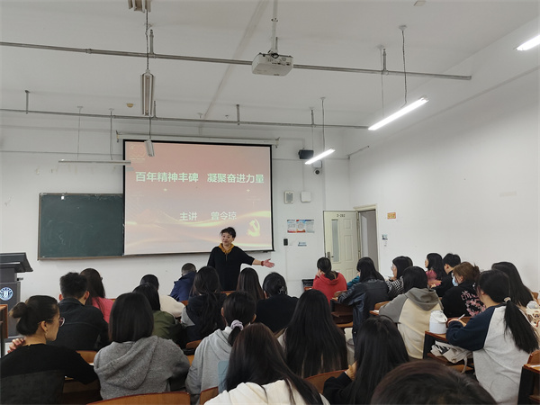 开班仪式结束后,由马克思主义学院曾令琼教授以“百年精神丰碑凝聚奋进力量”为题进行了本次培训班的首场讲座。期望同学们通过学习,能坚定理想信念,遵守党规党纪,增强党员意识,为党支部接收新党员做好准备工作。