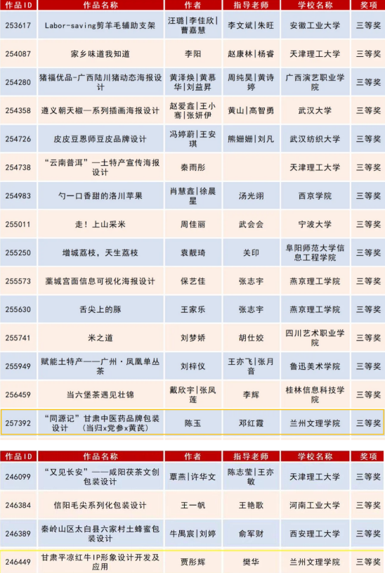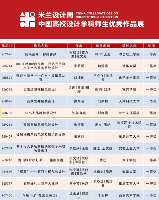 “米兰设计周·中国高校设计学科师生优秀作品展”大赛是中国高等教育学会发布的《全国普通高校学科竞赛排行榜》内榜单项目,今年特别增设了“设计赋能‘土特产’,助力乡村振兴”公益赛道。我院历来注重设计的社会服务功能,特别是设计赋能乡村振兴。此次大赛,邓红霞教师指导的2021视传2班学生沈年育鑫设计的作品“牛小友品牌包装设计”获得全国大赛一等奖、21视传1班陈玉同学的设计作品“‘同源记’甘肃中医药品牌包装设计”获得全国大赛三等奖,樊华教师指导的贾彤辉同学设计的作品“甘肃平凉红牛IP形象设计开发及应用”获得全国大赛三等奖。