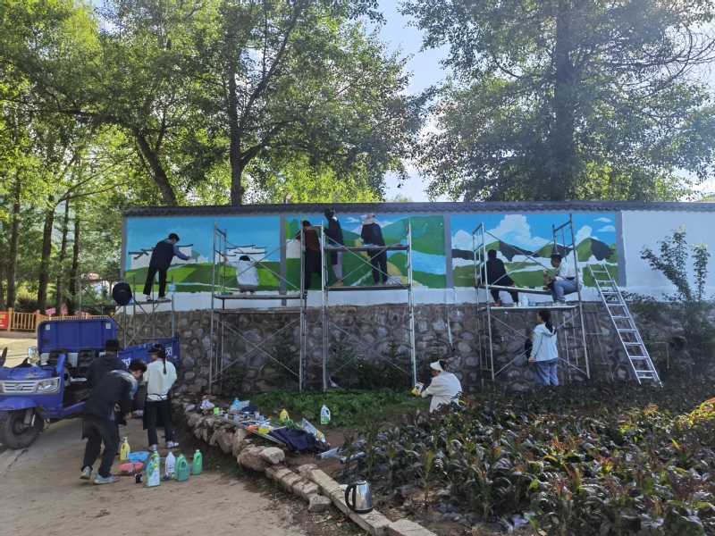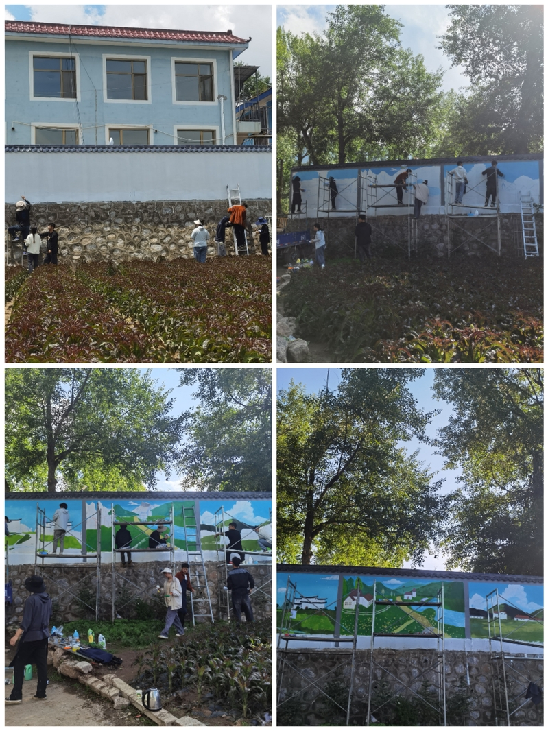 经过一个多小时的路程,7月1日10点,同学们到达实践场地,在阵雨和艳阳交替中,快速进入工作状态,大家开始帮忙搭脚手架,挑选绘画内容、潜心研究画面效果,充分发挥专业特长,用线条勾勒出一幅幅有乡村独特韵味的文化手绘作品,用实际行动助力乡村文化建设。