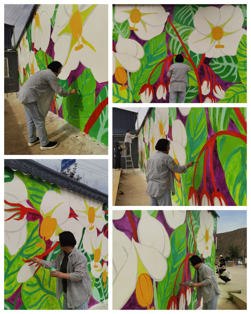 此次活动以“马铃薯花”为主题,贴合定西丰禾的马铃薯育种产业形象,花开正盛也象征着马铃薯产业的欣欣向荣。作品突破传统的写实表现方法,采用平面性设计使画面更具装饰性,颜色上使用强对比色,具有强烈的视觉冲击。同学们用绚丽的色彩和构图,以墙绘的艺术形式为载体,将这些地标景观生动地呈现在墙面上。