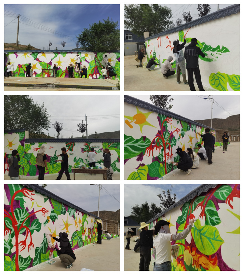 此次活动以“马铃薯花”为主题,贴合定西丰禾的马铃薯育种产业形象,花开正盛也象征着马铃薯产业的欣欣向荣。作品突破传统的写实表现方法,采用平面性设计使画面更具装饰性,颜色上使用强对比色,具有强烈的视觉冲击。同学们用绚丽的色彩和构图,以墙绘的艺术形式为载体,将这些地标景观生动地呈现在墙面上。