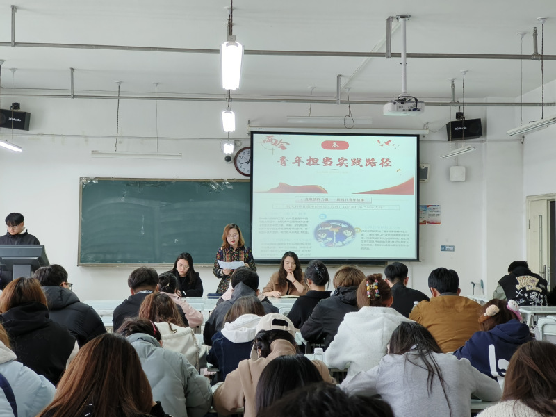 会上,唐老师介绍了2025年全国两会的盛况,阐释了政府工作报告中关于2024年取得的成绩、2025年发展主要预期目标、2025年重点工作部署和两会召开的重大意义。随后以《学习两会精神 共话青春梦想》为主题,从两会精神与青年机遇、大学生专业如何与国家需求同频共振、青年担当实践的有效路径三个方面,引导学生将个人理想与国家发展紧密结合,为实现中华民族伟大复兴的中国梦贡献力量。