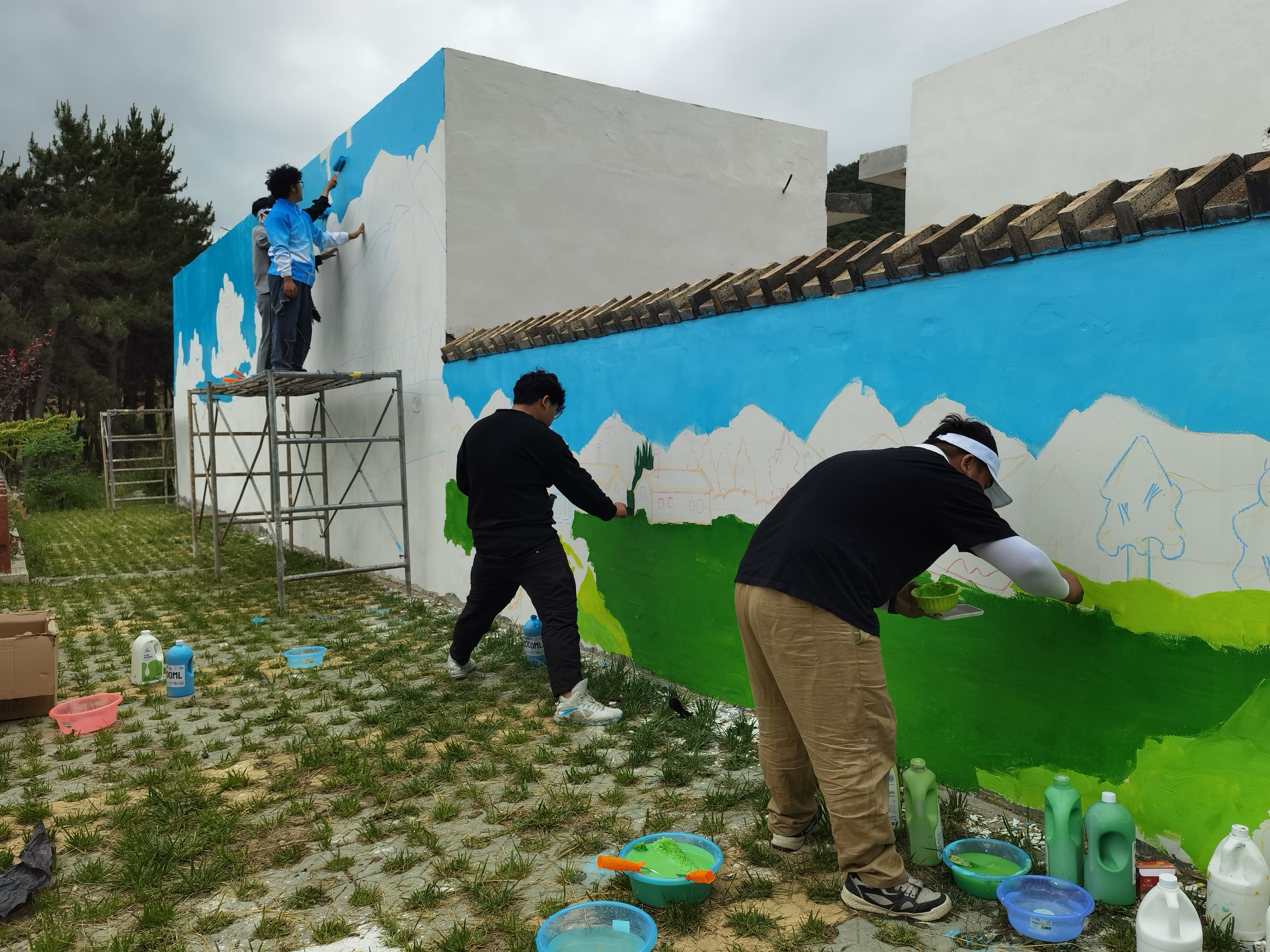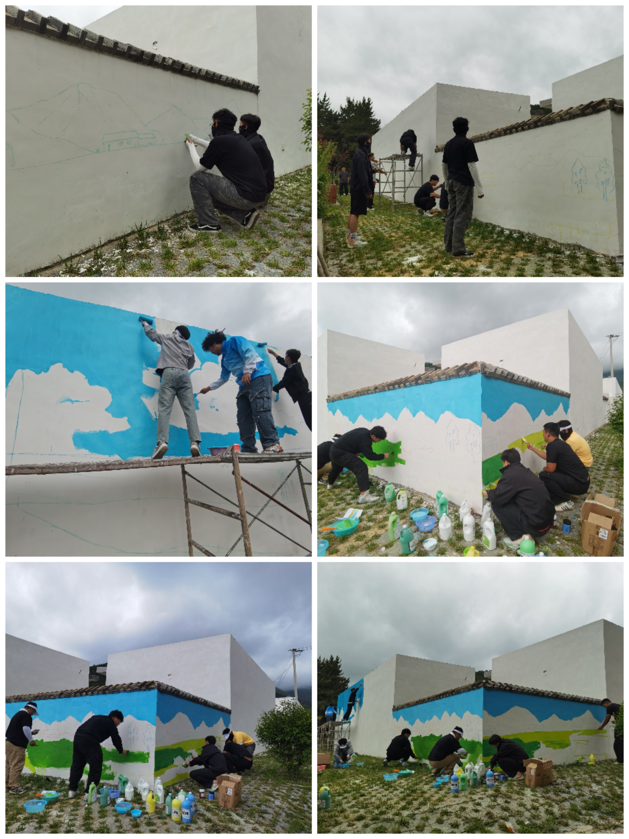 经过一个多小时的路程,7月1日10点,同学们到达实践场地,在阵雨和艳阳交替中,快速进入工作状态,大家开始帮忙搭脚手架,挑选绘画内容、潜心研究画面效果,充分发挥专业特长,用线条勾勒出一幅幅有乡村独特韵味的文化手绘作品,用实际行动助力乡村文化建设。
