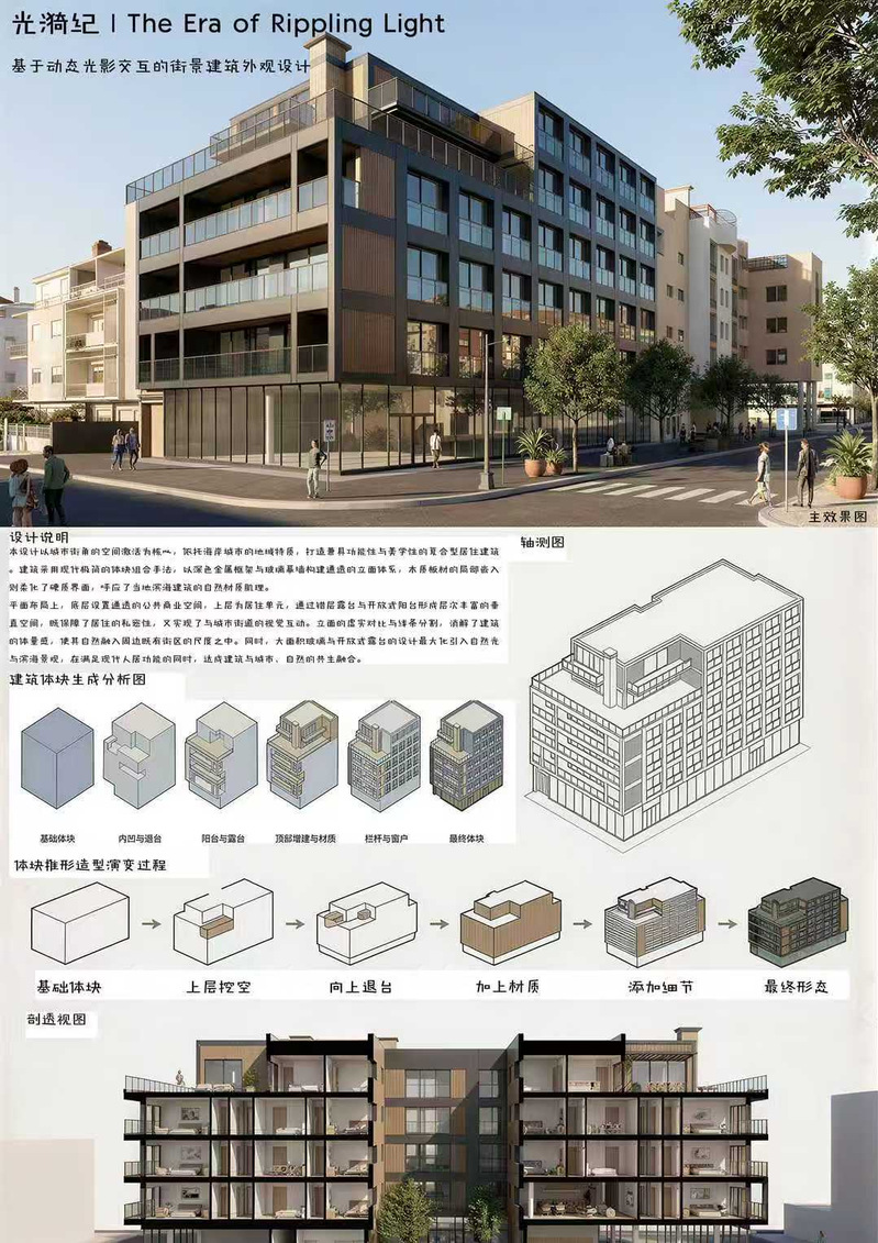 在课程中,主动将生成式AI、智能渲染、参数化分析等技术融入全流程,引导学生以AI为创意助手,快速完成概念草图生成、场地数据分析、效果可视化与方案迭代优化,有效缩短设计周期、提升表达精度。学生借助AI工具突破传统手绘与建模的效率瓶颈,在有限课时内完成多方案比选与细节深化,实现从“经验设计”向“数据驱动+创意共创”的转变。这一模式既夯实了学生的专业基本功,又培养了智能时代必备的数智素养与创新思维。